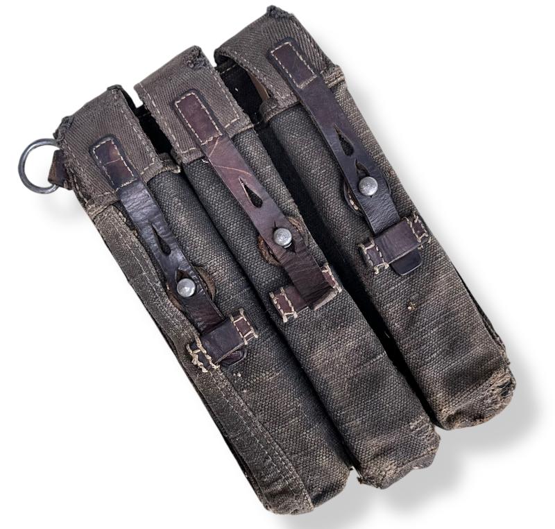 This is a beautiful early model MP38/40 pouch, featuring a rare variation with blue webbing. Designed to hold magazines for the MAB38 or Bergmann submachine guns, this pouch is in excellent condition and is clearly named 'uffz'.